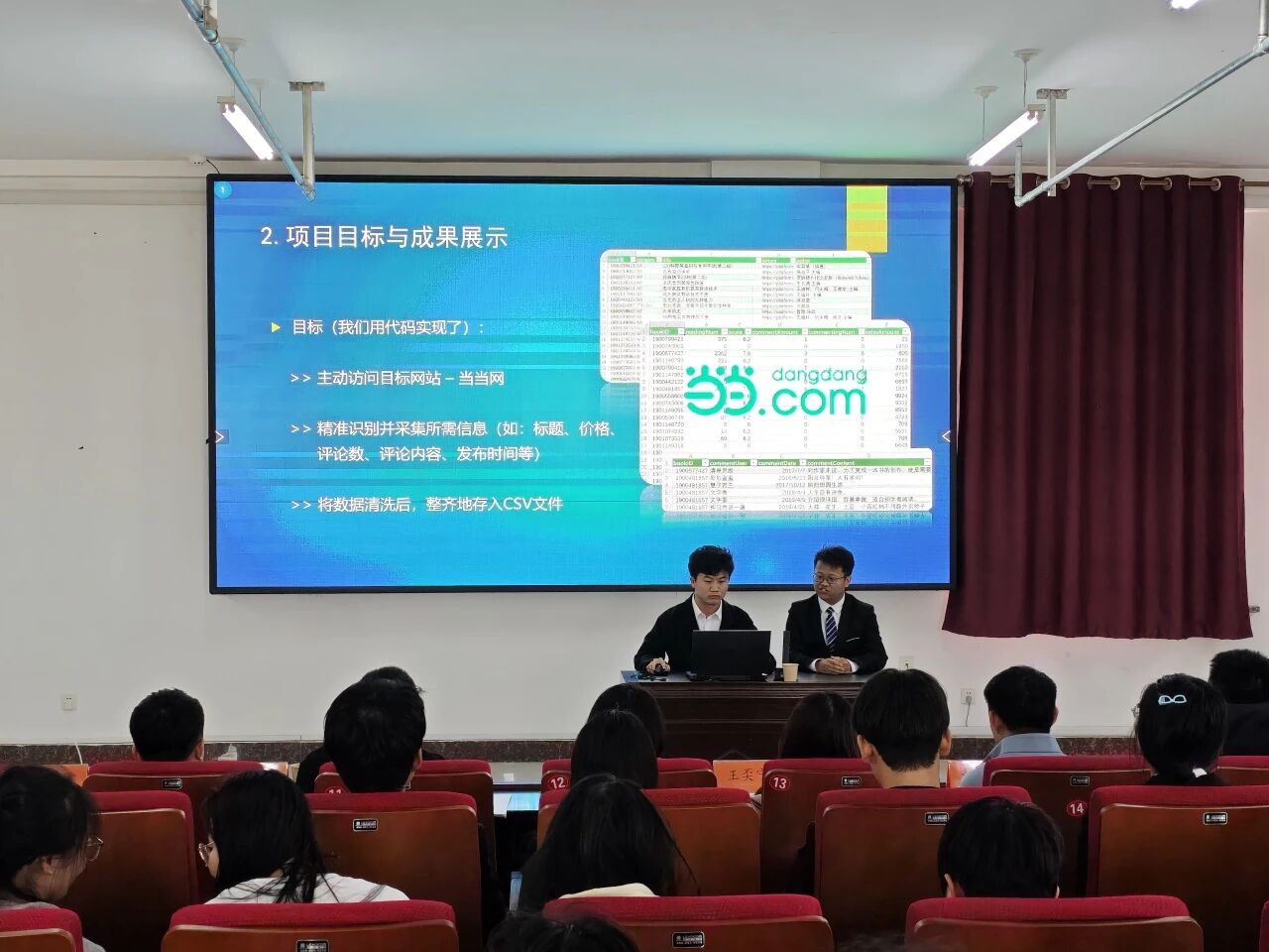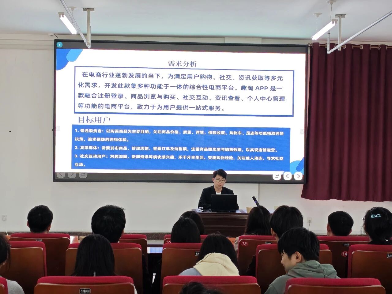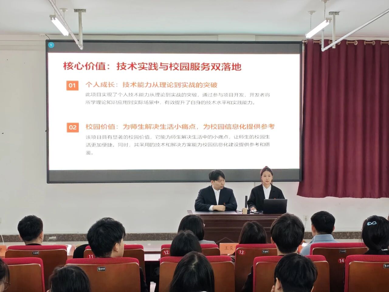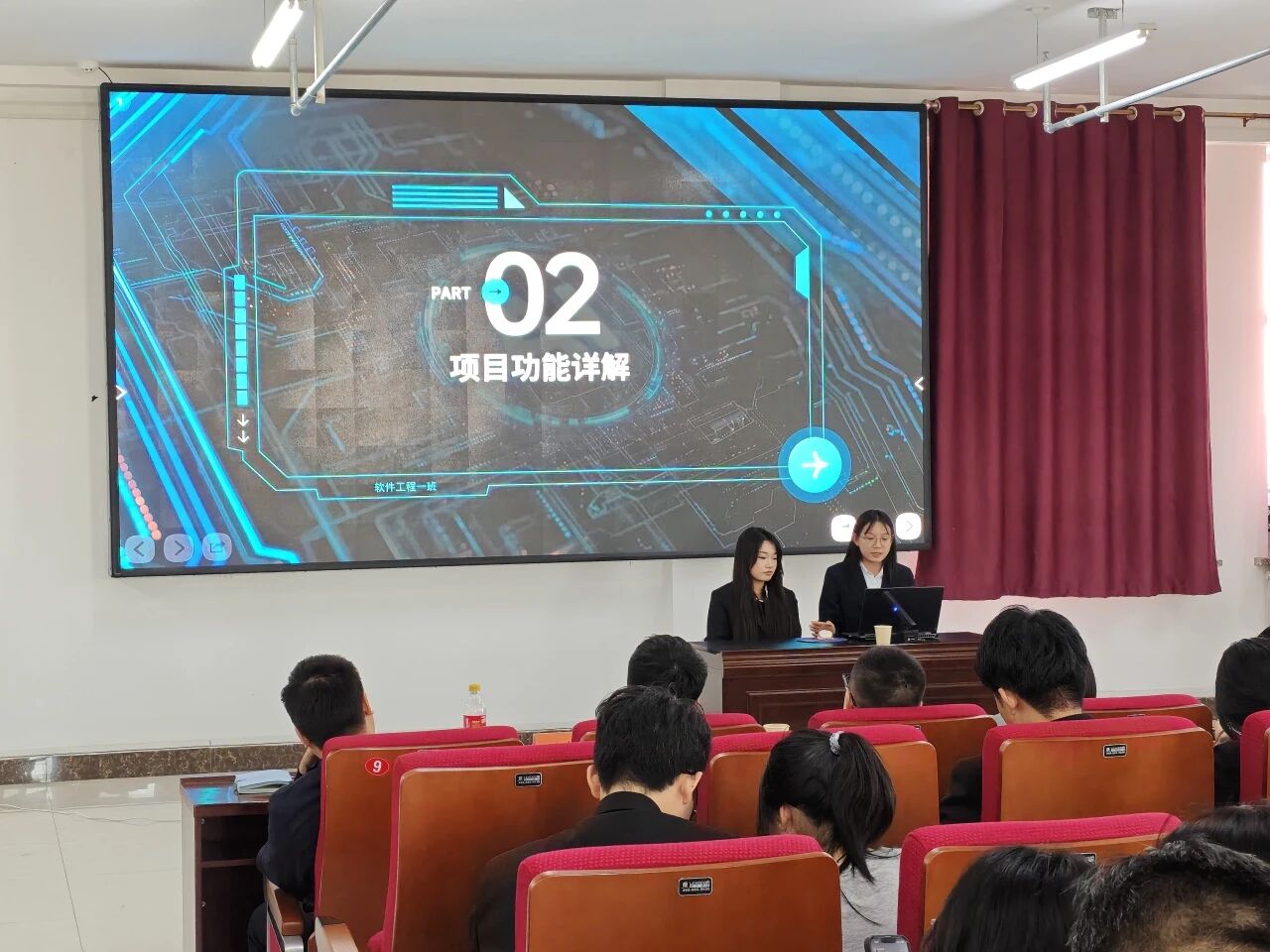 活动第二项,六支团队依次登台汇报,展示项目成果并进行答辩。各小组通过PPT展示、项目演示等形式,详细汇报了项目背景、创新点及应用前景等内容,部分同学凭借优异的表现,获得企业经理现场发出的录用意向,展现了同学们扎实的专业素养与创新潜力。在提问环节,各组成员基于项目成果回答了评委老师所提出的问题,评委团分别从专业知识、实践能力、创新思维等维度对学生回答进行了综合点评并现场打分。