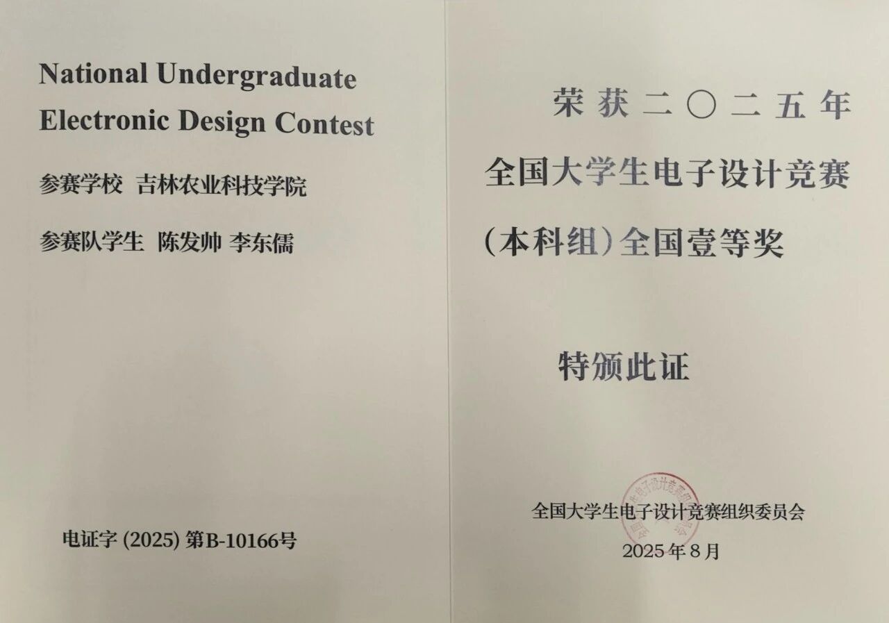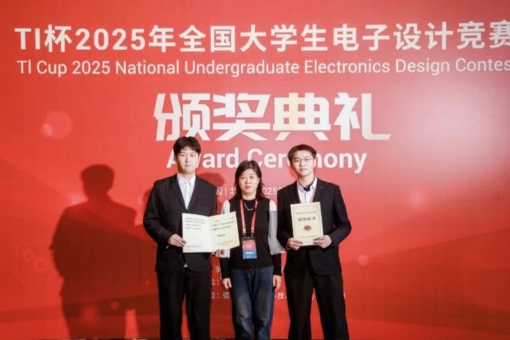 10月18日,2025年全国大学生电子设计竞赛国赛颁奖仪式在北京落下帷幕,电气与信息工程学院2022级电子信息科学与技术专业学生陈发帅、李东儒及指导教师王丽芬赴现场接受了全国一等奖颁奖。