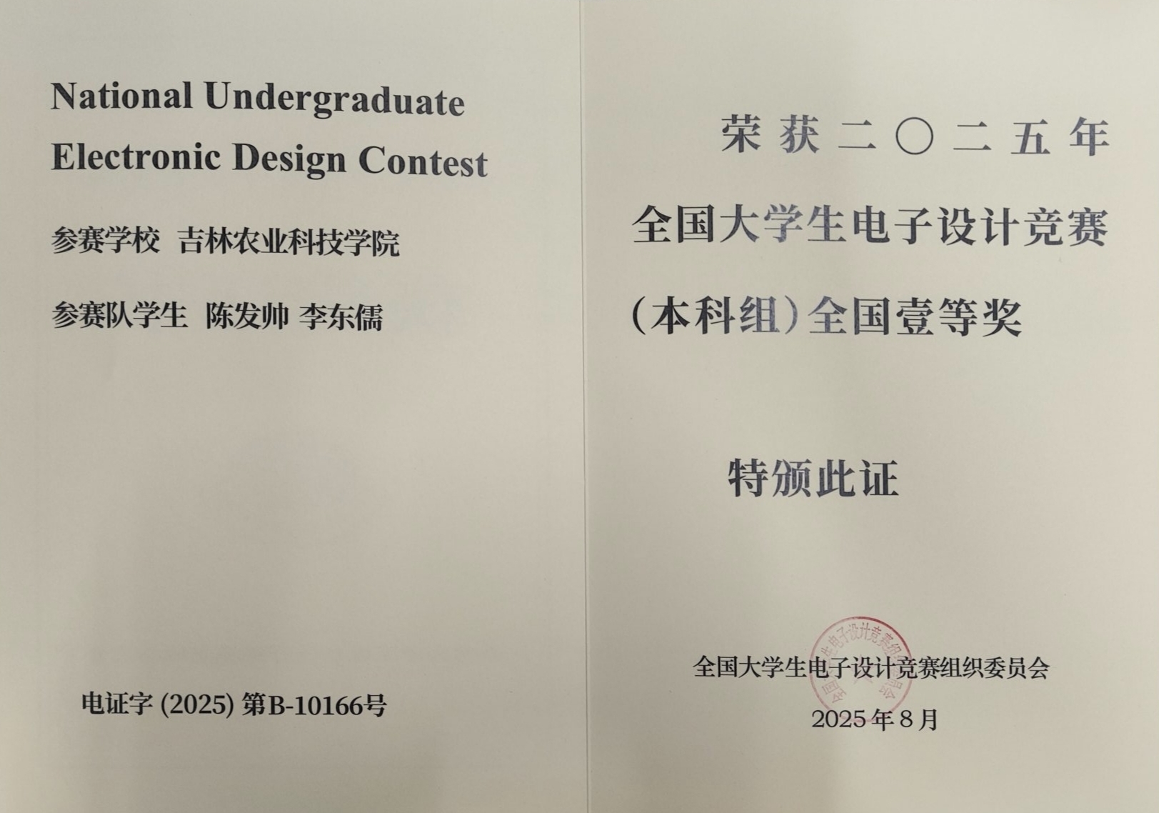 10月18日,2025年全国大学生电子设计竞赛国赛颁奖仪式在北京落下帷幕,我校电气与信息工程学院2022级电子信息科学与技术专业学生陈发帅、李东儒及指导教师王丽芬赴现场接受了全国一等奖颁奖。